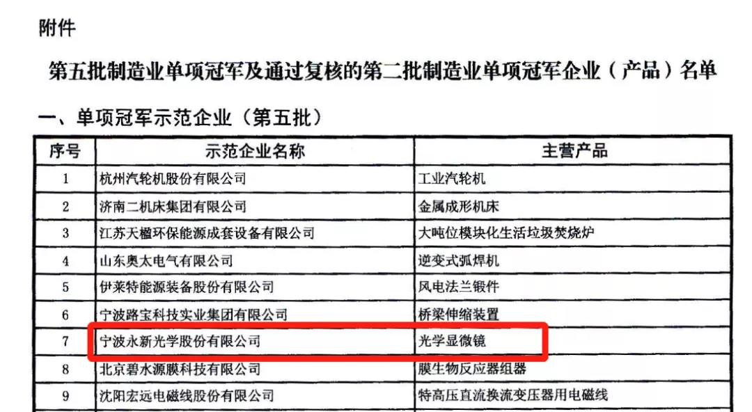 近日,工業(yè)和信息化部和中國工業(yè)經(jīng)濟聯(lián)合會公布了第五批制造業(yè)單項冠軍及通過復核的第二批制造業(yè)單項冠軍企業(yè)(產(chǎn)品)名單(工信部聯(lián)政法函〔2020〕351號),寧波永新光學股份有限公司成功復評升級為第五批國家級制造業(yè)“單項冠軍示范企業(yè)”。