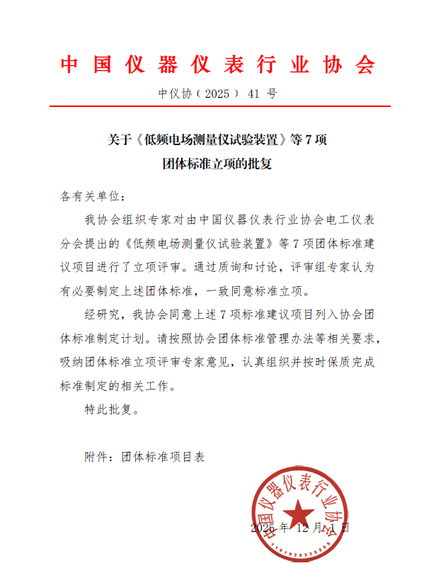 關(guān)于《低頻電場(chǎng)測(cè)量儀試驗(yàn)裝置》等7項(xiàng)團(tuán)體標(biāo)準(zhǔn)立項(xiàng)的批復(fù)
