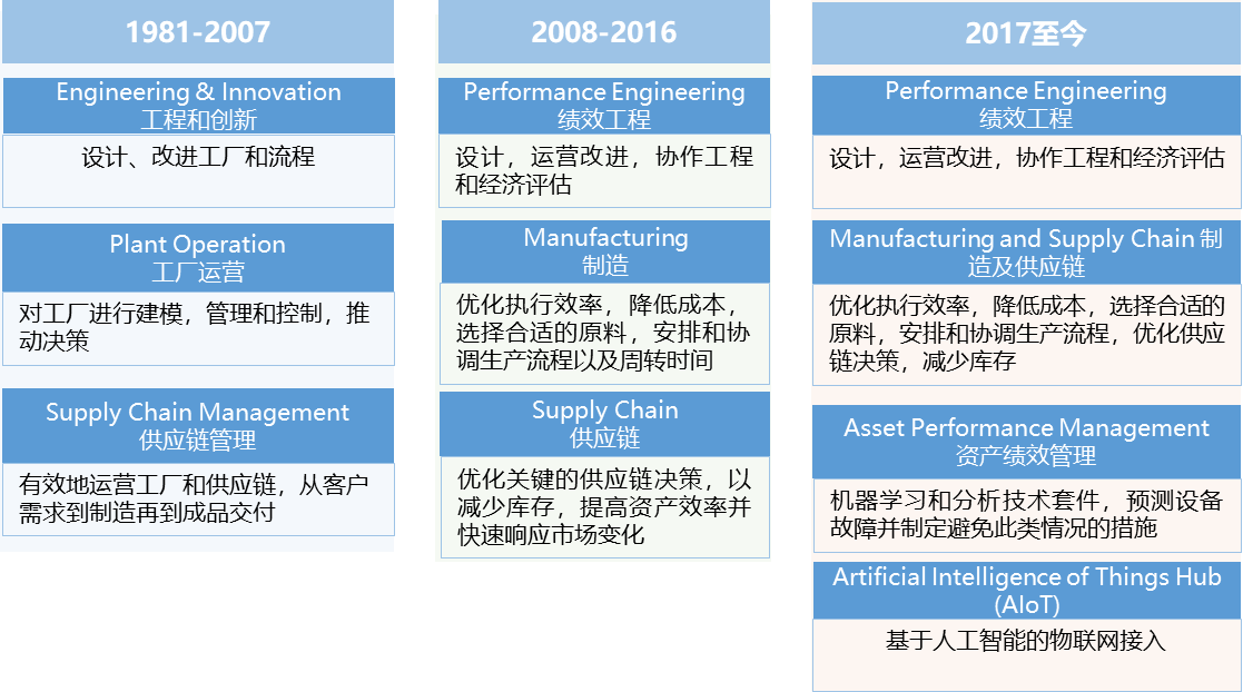 并購發展階段:從 1996 年起,艾斯本收購了超過 25 個領域中最優秀的公司,打造了涵蓋績效工程、制造與供應鏈、資產績效管理三大類軟件的產品線,廣泛應用于能源、化工、制藥、工程設計以及其他采用化學工藝生產產品的行業,如圖 3 所示。這與艾斯本從流程模擬、優化到人工智能的業務發展邏輯保持同步。2021年 10 月,艾默生以 60 億美元現金獲得艾斯本55% 的多數股權,并將旗下 OSI 公司的電力軟件和地質建模軟件業務并入艾斯本業務中。