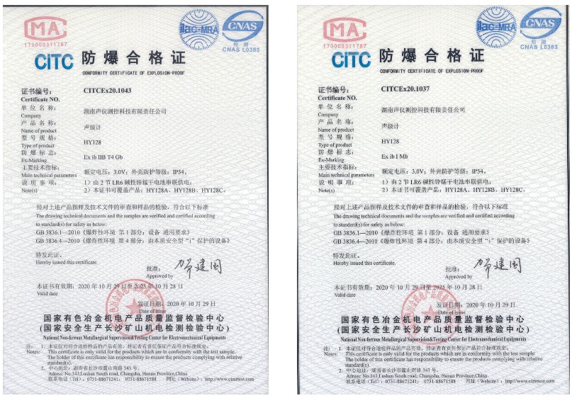 2020年10月28日,湖南聲儀測(cè)控所研發(fā)的HY128系列多功能聲級(jí)計(jì),含HY128、HY128A、HY128B、HY128C四種型號(hào)產(chǎn)品,順利通過國(guó)家有色冶金機(jī)電產(chǎn)品質(zhì)量監(jiān)督檢測(cè)中心防爆認(rèn)證,同時(shí)獲得本安防爆、礦用本安防爆合格證。這意味著該系列產(chǎn)品能進(jìn)一步適應(yīng)不同場(chǎng)所和不同環(huán)境下的廣泛應(yīng)用,并且有更多型號(hào)和不同功能供客戶根據(jù)需要提供貼切選擇。