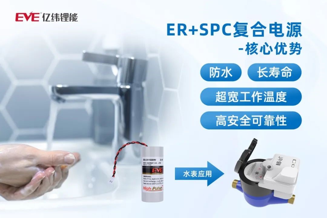 億緯鋰能擁有智能水表全系列解決方案,包括ER、CR、ES復合電源,其中,由億緯鋰能自主創新研發的ES復合電源方案,兼顧了鋰亞電池長壽命、電池電容器輸出大脈沖的優勢,有效地保障水表更穩定、精確、長壽命運行,且采用獨特的電池組灌膠工藝,可以滿足水浸場景應用。