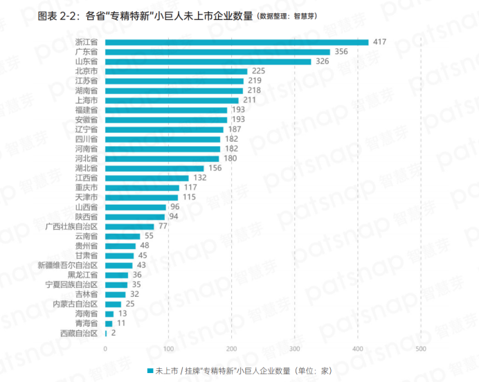 《報告》顯示,更進一步研究“專精特新”小巨人企業上市/掛牌情況可以發現,“專精特新”小巨人企業上市/掛牌占比不到總數15%,也就是有超過85%的企業都將可能成為我國二級市場的潛在企業,其中, 浙江省有417家,廣東省有356家,山東省有326家,北京市有225家,江蘇省有219家。
