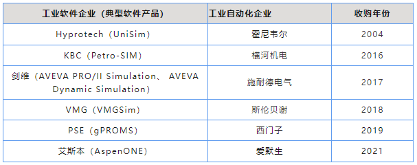 工業(yè)軟件的演進就是“大魚吃小魚”的過程。從20世紀90年代以來,收購和兼并成為國際 自動化企業(yè)擴張和數字化轉型的一個重要手段。進入21世紀以后,工業(yè)軟件的重要性日益凸顯,工業(yè)軟件成為自動化巨頭下半場爭奪戰(zhàn)的關鍵。西門子、施耐德電氣、愛默生、霍尼韋爾、海克斯康等工業(yè)硬件巨頭,紛紛加快并購優(yōu)質工 業(yè)軟件企業(yè),與自身的工業(yè)自動化、工業(yè)測量等拳頭產品形成軟硬一體的解決方案 。市場占有率靠前的商業(yè)流程模擬軟件全部被工業(yè)動化頭部企業(yè)收購,詳見表 1。