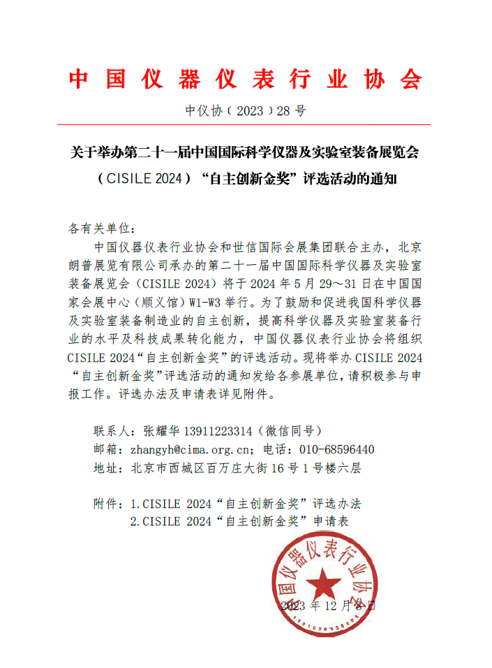 中國儀器儀表行業協會和世信國際會展集團聯合主辦,北京朗普展覽有限公司承辦的第二十一屆中國國際科學儀器及實驗室裝備展覽會(CISILE 2024)將于202452931日在中國國家會展中心(順義館)W1-W3舉行。為了鼓勵和促進我國科學儀器及實驗室裝備制造業的自主創新,提高科學儀器及實驗室裝備行業的水平及科技成果轉化能力,中國儀器儀表行業協會將組織CISILE 2024“自主創新金獎”的評選活動。現將舉辦CISILE 2024“自主創新金獎”評選活動的通知發給各參展單位,請積極參與申報工作。評選辦法及申請表詳見附件。