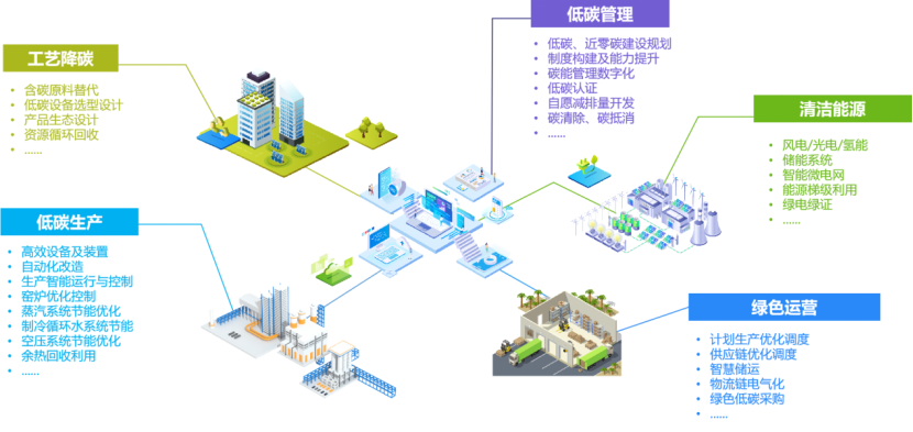 PhaseⅡ—零碳工廠:在低碳工廠的基礎上進一步通過能源結構調整、資源循環利用、碳清除、碳抵消等方式實現整體對外溫室氣體排放為零。