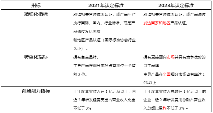 2021 VS 2023專精特新“小巨人” 企業(yè)認(rèn)定標(biāo)準(zhǔn)變化對比