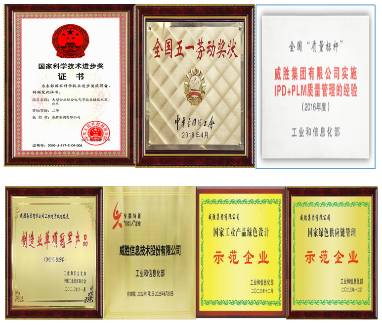 威勝榮獲國家級科技進步二等獎 1 項,中國專利優秀獎 1 項,其他省、市級科技獎多項。2016 年威勝榮獲國家工信部“2016 年智能制造試點示范項目”、全國“質量標桿企業 ”稱號,2017 年榮獲第五屆湖南省省長質量獎,2018 先后榮獲“全國五一勞動獎狀 ”與“ 中國企業文化建設先進單位 ”。2019 年三相電子式電能表成功入選工信部第四批制造業單項冠軍產品,2021 年榮獲國家工信部頒發的“工業互聯網試點示范項目”和“智能光伏試點示范企業” ,2022 年榮獲國家級專精特新“小巨人”企業和中國電工技術學會科學技術獎科技進步一等獎,2023 年榮獲“ 國家知識產權優勢企業、國家級工業產品綠色設計示范企業、國家級綠色供應鏈管理企業 ”稱號。