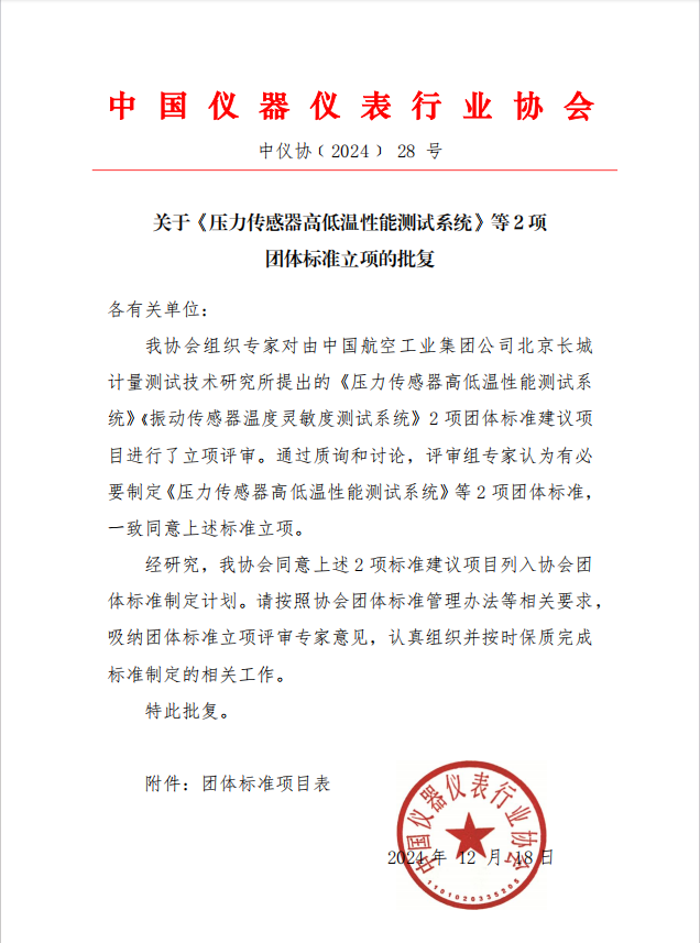 根據《中國儀器儀表行業協會團體標準管理辦法》的規定,經審查,對由中國航空工業集團公司北京長城計量測試技術研究所(簡稱“304所”)提出的《壓力傳感器高低溫性能測試系統》 《振動傳感器高低溫性能測試系統》2項團體標準進行立項(標準編號和標準名稱見公告附件),特此公告。