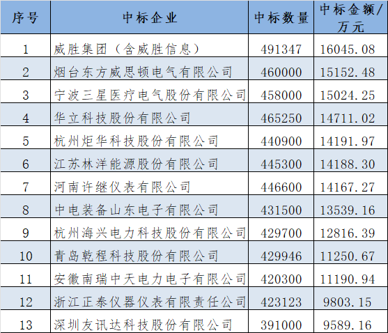 其中,本次招標電能表采集部分最終總中標金額為44.12億元,電能表分項中標企業共68家,相比2025年第一次招標減少4家;用電信息采集分項中標企業54家,相比2025年第一次招標增加29家,主要受本次招標新增智能融合終端產品影響。本次中標金額前五名企業為威勝集團(含威勝信息)、煙臺東方威思頓電氣有限公司、寧波三星醫療電氣股份有限公司、華立科技股份有限公司、杭州炬華科技股份有限公司;本次招標計量互感器部分最終總中標金額為2.63億元,占2024年度總金額的17%。總共有40家企業實現中標。本次中標金額前三名企業為浙江天際互感器股份有限公司、河南許繼儀表有限公司、重慶華虹儀表有限公司。