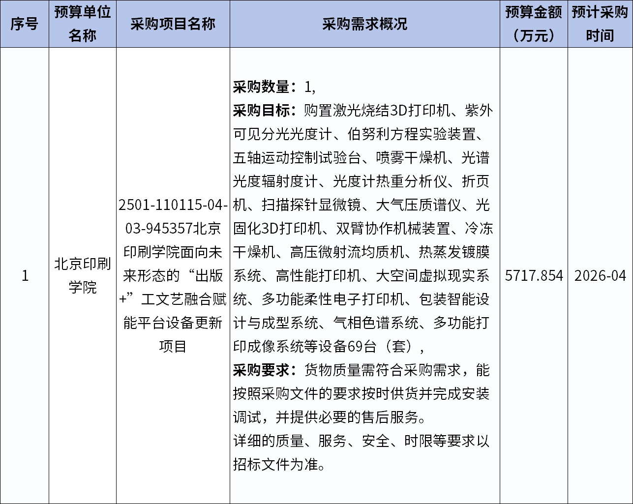 北京印刷學(xué)院面向未來(lái)形態(tài)的“出版+”工文藝融合賦能平臺(tái)設(shè)備更新項(xiàng)目公開(kāi),計(jì)劃購(gòu)置激光燒結(jié)3D打印機(jī)、紫外可見(jiàn)分光光度計(jì)、伯努利方程實(shí)驗(yàn)裝置、五軸運(yùn)動(dòng)控制試驗(yàn)臺(tái)、噴霧干燥機(jī)、光譜光度輻射度計(jì)等69臺(tái)(套)設(shè)備,預(yù)算金額5717.854萬(wàn)元,預(yù)計(jì)2026年4月采購(gòu)。