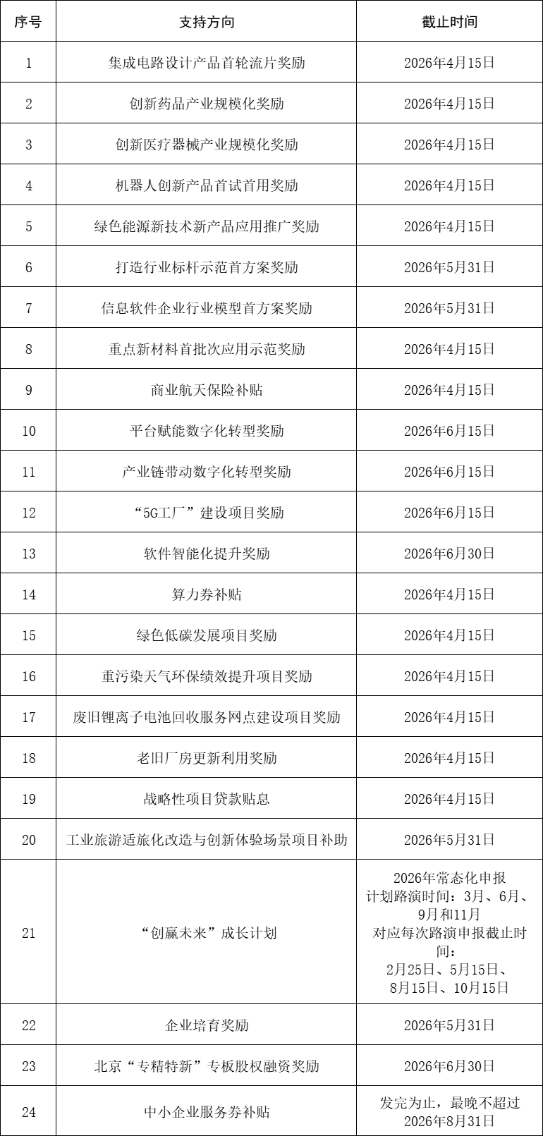 2.申報(bào)項(xiàng)目中已通過其他市級財(cái)政資金支持的實(shí)施內(nèi)容,高精尖項(xiàng)目資金、中小資金原則上不再予以重復(fù)支持。同一單位原則上只能獲得2026年內(nèi)高精尖項(xiàng)目資金單個(gè)方向支持;對落實(shí)國家重大戰(zhàn)略部署和北京市重點(diǎn)任務(wù)的,可獲得多種方式支持。對確需以高精尖項(xiàng)目資金、中小資金等相關(guān)專項(xiàng)資金管理辦法規(guī)定之外支持方式和標(biāo)準(zhǔn)支持的項(xiàng)目,應(yīng)報(bào)市政府審定后執(zhí)行。