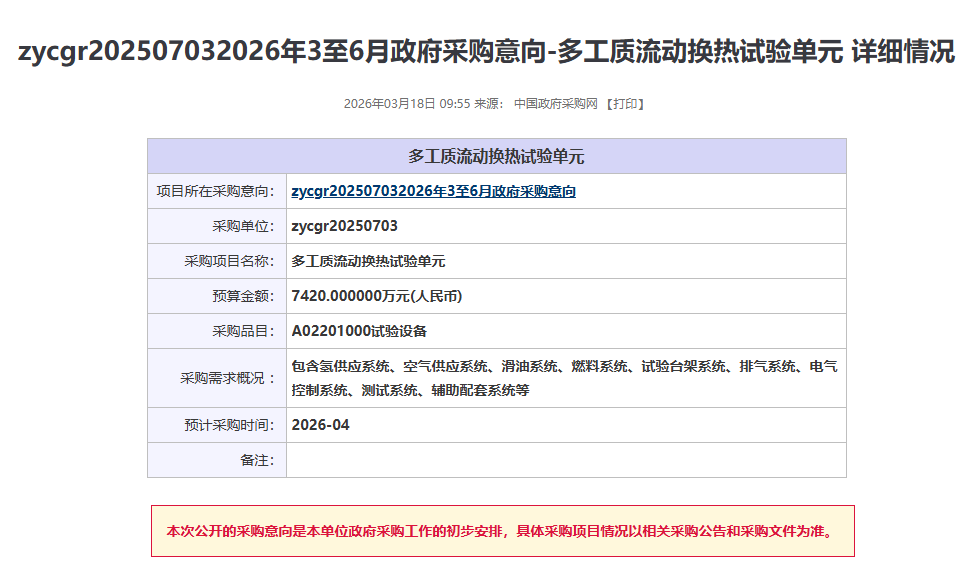 近期,zycgr20250703發布兩項儀器采購意向,采購預算金額11568萬元,涉及儀器設備包括多工質流動換熱試驗單元、熱管理系統多元耦合特性試驗設備,預計采購時間2026年4月。
