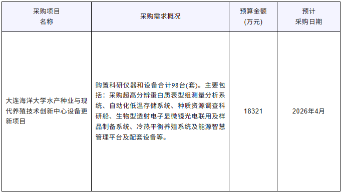 近期,大連海洋大學發布多項儀器采購意向,采購預算金額18321萬元,涉及儀器設備包括超高分辨蛋白質表型組測量分析系統、自動化低溫存儲系統、種質資源調查科研船、生物型透射電子顯微鏡光電聯用及樣品制備系統、冷熱平衡養殖系統及能源智慧管理平臺及配套設備等。預計采購時間2026年4月。