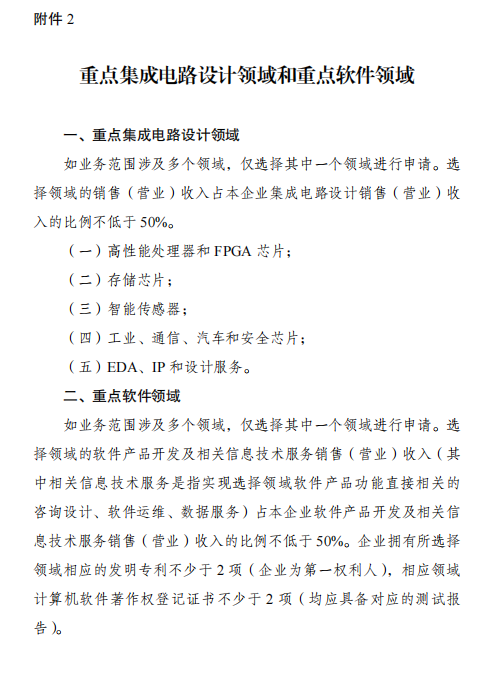 一、本通知所稱清單是指《若干政策》第(一)條提及的國家鼓勵的集成電路線寬小于28納米(含)、線寬小于65納米(含)、線寬小于130納米(含)的集成電路生產企業或項目的清單;《若干政策》第(三)、(六)、(七)、(八)條和《財政部、海關總署、稅務總局關于支持集成電路產業和軟件產業發展進口稅收政策的通知》(財關稅〔20214號)、《財政部、國家發展改革委、工業和信息化部、海關總署、稅務總局關于支持集成電路產業和軟件產業發展進口稅收政策管理辦法的通知》(財關稅〔20215號)提及的國家鼓勵的重點集成電路設計企業和軟件企業,集成電路線寬小于65納米(含)的邏輯電路、存儲器生產企業,線寬小于0.25微米(含)的特色工藝集成電路生產企業,集成電路線寬小于0.5微米(含)的化合物集成電路生產企業和先進封裝測試企業,集成電路產業的關鍵原材料、零配件(靶材、光刻膠、掩模版、封裝載板、拋光墊、拋光液、8英寸及以上硅單晶、8英寸及以上硅片)生產企業,集成電路重大項目和承建企業的清單;《公告》提及的國家鼓勵的集成電路生產企業或項目歸屬企業、國家鼓勵的集成電路設計企業清單。