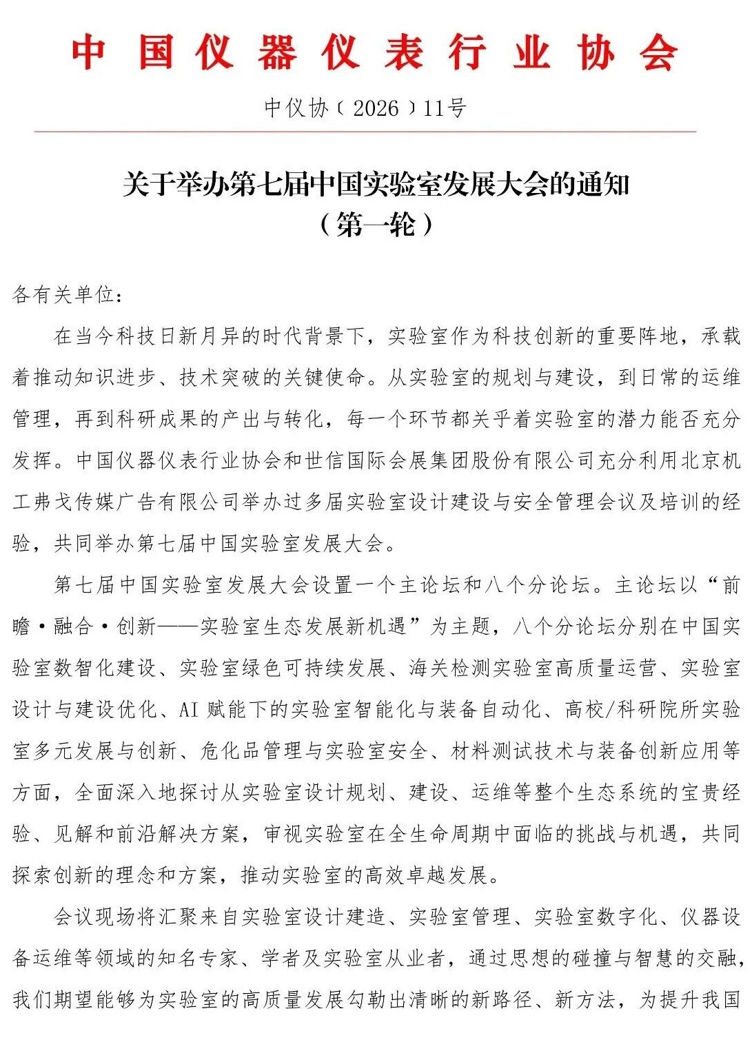 關于舉辦第七屆中國實驗室發展大會的通知(第一輪)