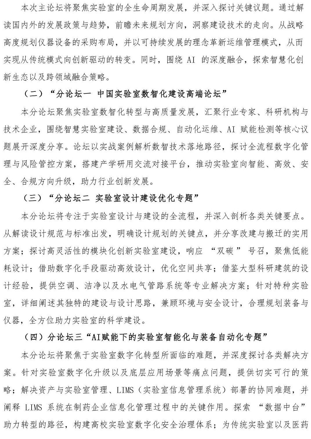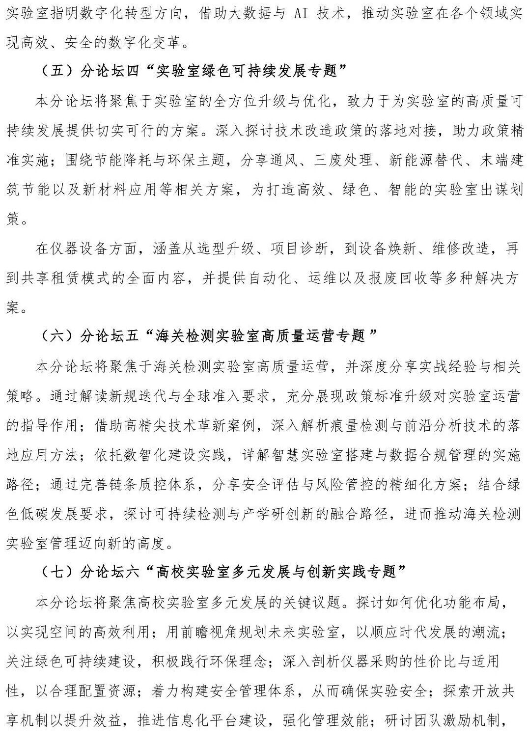第七屆中國實驗室發展大會設置一個主論壇和八個分論壇。主論壇以前瞻・融合・創新——實驗室生態發展新機遇”為主題,八個分論壇分別在實驗室綠色可持續發展、海關檢測實驗室高質量運營、實驗室設計建設與優化、AI賦能下的實驗室智能化與裝備自動化、高校/科研院所實驗室多元發展與創新、危化品管理與實驗室安全、中國實驗室數智化建設、材料測試技術與裝備創新應用等方面,全面深入地探討從實驗室設計規劃、建設、運維等整個生態系統的寶貴經驗、見解和前沿解決方案,審視實驗室在全生命周期中面臨的挑戰與機遇,共同探索創新的理念和方案,推動實驗室的高效卓越發展。
