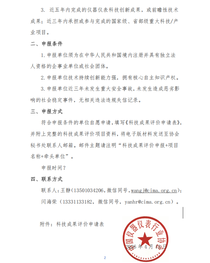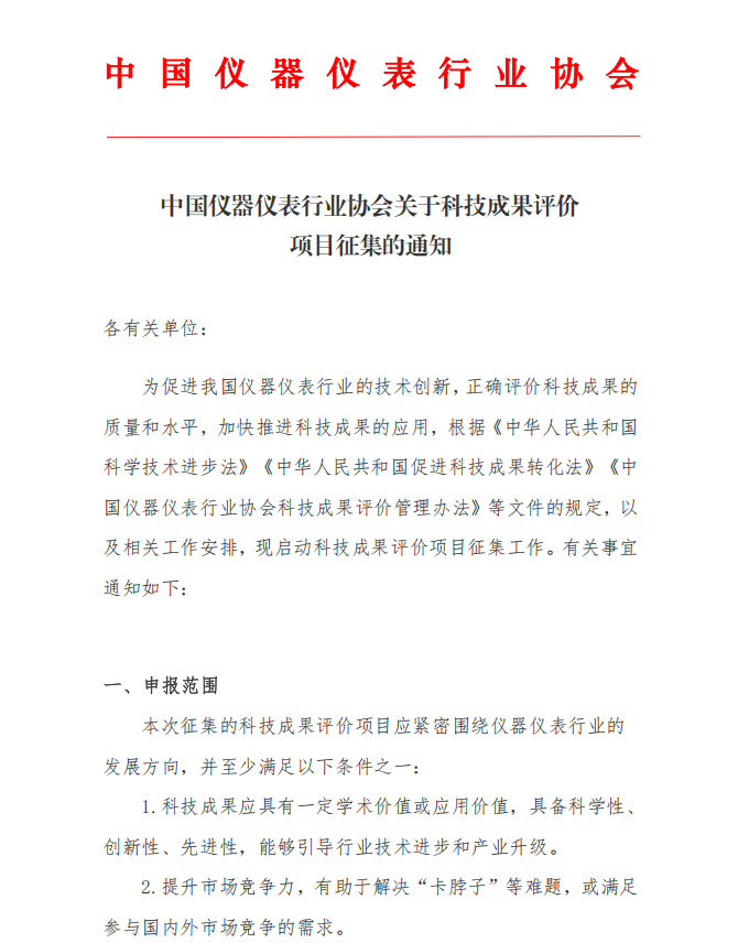 中國儀器儀表行業協會關于科技成果評價項目征集的通知